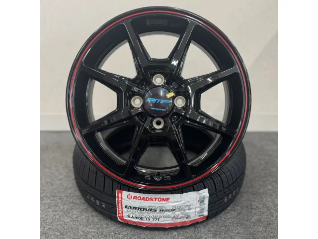 ●ホイール/新品 MID RMPレーシングR25 1550-1004H+45(BK/リムRED) ●タイヤ/新品 ロードストーン HP02 165/60R15 作業工賃込み ¥90400-