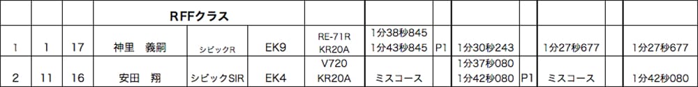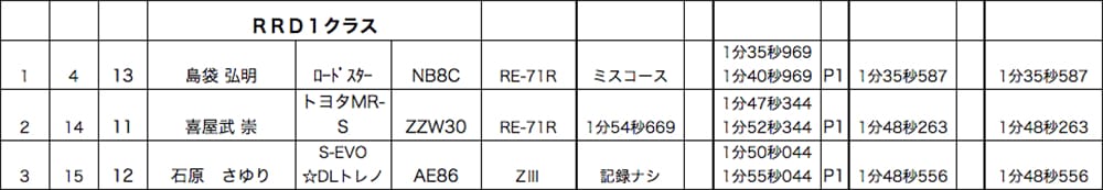 開幕戦と同様、アジアンタイヤで練習走行を走ったNBロードスター島袋選手。あまりのグリップ感のなさにアタックではポテンザRE71Rを投入し、クラス唯一の35秒台をたたき出し開幕2連勝を飾りました。2位に入ったのはMR-S喜屋武選手。1本目パイロンタッチで後のない状況から丁寧に走りきり、コンマ差の2位争いを制しました。3位はAE86レビン 石原選手。こちらも1本目パイロンタッチで後がないなか、攻めましたがわずかにとどかず、次戦での巻き返しに期待です!