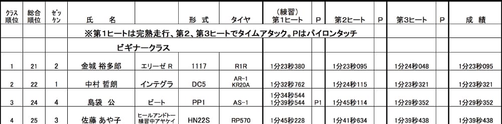 ビギナークラスの選手はもちろん、エキスパート勢のドライバーをも苦しめた本部席前のイシグロターンを配置したランエボ石黒選手が、最終アタックでキッチリとそのターンを決めて、今季参戦2戦目で早くも初優勝をGET!2位はGDBインプレッサ上原選手。午後からの参加で本番アタックは1本のみとなりましたが、そこで集中力を発揮して1分12秒台の好タイムをマーク!これでシリーズポイント3位と、なんとかチャンピオン争いに踏み止まりました。苦手な?右ターンとなる石黒ターンに苦しみ、コーナー区間で取り返すべく全力アタックしましたが届かず。それでもなんとかシリーズポイントトップは死守しました。