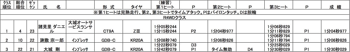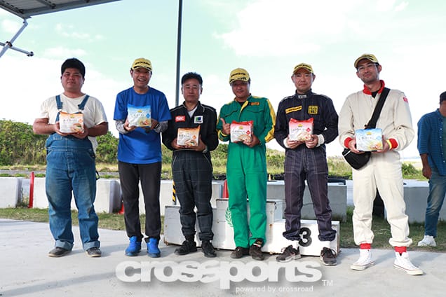 最終戦までシリーズチャンプが決まっていなかったR4WDクラス。諸見里選手と謝敷選手の最終決戦となりましたが、そのバトルを制したのはランエボ諸見里選手。テクニカルなコースに苦しみましたが、唯一のノーペナルティーとなった第2HEATのタイムで今季4勝目を挙げ、見事2年連続のシリーズチャンプを優勝で飾りました。2位はGDBインプレッサ謝敷選手。豊富な練習量と熱心な研究姿勢で実力を付けてきて今シーズンのR4WDクラスを盛り上げてくれましたが、シリーズチャンプは来年以降にお預けとなりました。3位は謝敷選手のマシンをレンタルして参戦した大城選手。馴れないマシンながらさすがのテクニックでいいターンを見せてくれました。