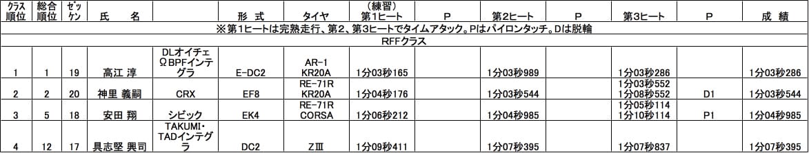 全日本SA2クラスシリーズチャンプを獲得し、今沖縄のモータースポーツ界で一番熱い男、高江淳選手の凱旋参戦となったRFFクラス。その高江選手と、エキジムのシリーズチャンプ神里選手が物凄いハイレベルなバトルを披露してくれました。最終アタックでタイムを大きく上げ、逆転で僅差のバトルを制したのはDC2高江選手。全日本チャンプのテクニックを存分に披露してくれました!惜しくもコンマ差で高江選手には届きませんでしたが、こちらもあり得ないほどの超速ターンを見せて会場を盛り上げてくれたCR-X神里選手が2位獲得!今回のコースを作成したEK4安田選手が3位。鬼二人には負けてしまいましたが、着実に力がついてきているので来シーズンは期待大だ!
