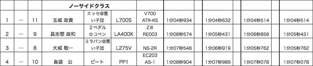 今回のノーサイドクラスを制したのは、エッセの玉城選手。走るたびにじわじわとタイムを上げていき、3ヒート共TOPタイムの完勝で3月大会に続き2度目のNSクラス優勝を果たしました。2位はコペンで参戦の具志堅選手。NSクラス初開催から4戦連続で参戦し、7位→4位→3位→2位と着実に優勝に近づいてきており、次戦での初優勝に期待がかかります!!前回NSXで見事NSクラス初優勝を飾った大城選手が今回はミラバンでの参戦。正反対の車ですが、これまで2月からどちらのマシンでも必ず表彰台をゲットしています!