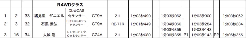 3台の生タイムが0.3秒以内という差の痺れる四駆バトルを制したのは、ランエボ諸見里選手。3ヒート共に1分3秒前半という安定した走りで、昨年シリーズ最終戦依頼となる久々の優勝をゲットしました。練習走行で驚異の1分1秒台を叩き出したランエボ石黒選手でしたが、本番の第2/第3HEATは惜しくも諸見里選手に届かず2位となりました。三位入賞は第2/第3ヒートのペナルティが響いた大城選手。生タイムはTOPに遜色無かっただけに残念である。