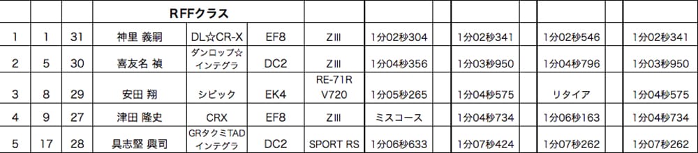 RRD2クラスを制したのは、SW20登川選手。これで今季RRD2クラス成立3戦3勝と、昨年からのシリーズ戦連勝継続中!!2位はAE86石原選手。王者登川選手をコンマ2秒以内まで追い詰めましたが、最終アタック惜しくもタイムアップならずわずかに届きませんでした。3位はマシンをS14からS15へスイッチしてきた野村選手。前日にマシンが仕上がりぶっつけ本番となりましたが、キッチリ乗りこなしまずまずのタイムを記録しました。次戦以降セッティングが決まればまだまだ速くなりそうです!!