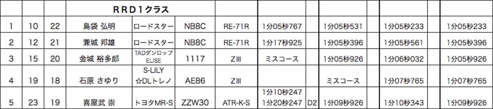 前回大会で久々に優勝を逃していたロードスター島袋選手。第2ヒートまでは兼城選手の後塵を拝し2戦連続で敗北か!?と思われましたが、最終アタックに底力を見せつけ逆転で今季3勝目!2位はロードスター兼城選手。第2ヒートまでTOPタイムをマークし初優勝の期待が掛かりましたが、最終アタックにタイムを伸ばせず惜しくも島袋選手にコンマ差でかわされました。3位には前回大会からRRD1へ昇格してきたエリーゼの金城雄選手。早くもTOPとコンマ差まで迫るタイムをマークだけに今後に注目の選手だ。