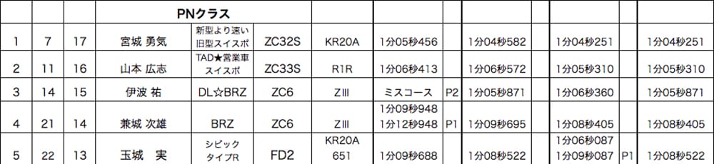 開幕から4連勝と、早くも連続シリーズチャンプへ大手を掛けたのはZC32Sスイフトの宮城勇気選手。クラス唯一の1分4秒台を叩き出し、2位へ1秒以上の差を付け完勝!どこまで連勝を伸ばすのか注目です!!2位はZC33Sスイフト山本広志選手。最終アタックに一気に1秒以上のタイムアップを果たし伊波選手をかわして3戦連続の2位ゲット!!3位は2月の開幕戦以来の参戦となったBRZ伊波祐選手。新品タイヤで今季初優勝を狙いましたが、最終アタックはタイムダウンに終わり1月の伊是名以来の優勝はなりませんでした。