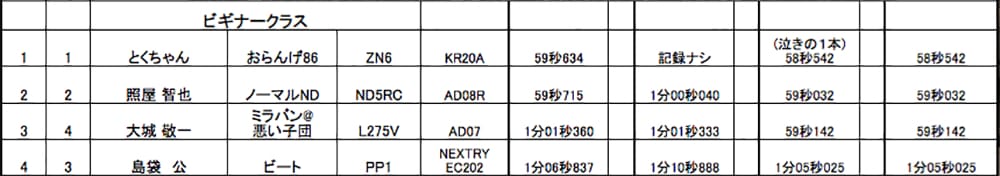前回に続きビギナークラスを制したのは、86を駆るとくちゃん選手。第3HEAT終了時点で3位に沈んでいましたが、クラス唯一の「泣きの一本」を選択して見事0.7秒の大幅タイムアップを果たし通算3勝目をゲットしました。2位はロードスター照屋選手。第3HEAT終了時点でTOPに立っており、泣きの一本を選択しなかったロードスターの照屋選手でしたが、とくちゃん選手にかわされ惜しくも2戦連続の2位となりました。3位はミラバンで参戦の大城選手。第3HEATに1秒以上のタイムアップを果たし僅差の2位まで上がりましたが、こちらも泣きの一本のとくちゃん選手に逆転を許してしまいました。