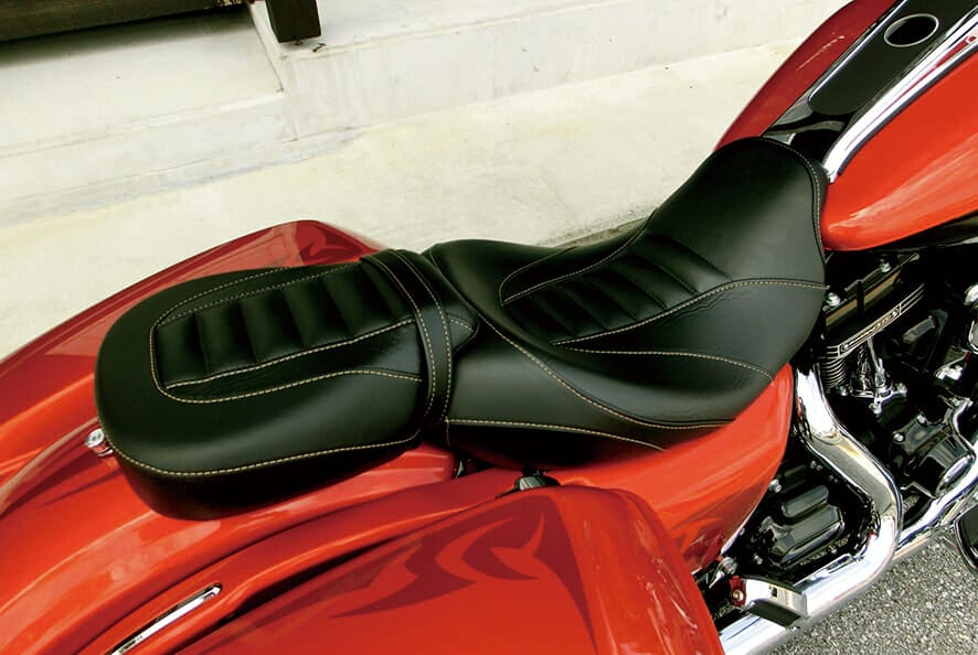 高級感のあるレザーと丁寧な縫製で仕上げたタック&ロールシートはバイクとの一体感を感じさせてくれる重要なアイテムだ