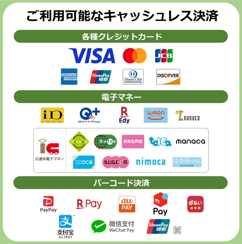 現金、各種クレジットカード、各種電子マネー・QR決済可能です